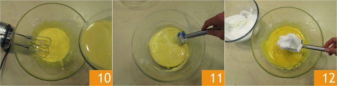 You should obtain a firm and frothy mixture 7. Set the beaten egg whites aside and add the remaining sugar to the egg yolks 8, then beat everything at moderate speed 9 until you get a light mixture.