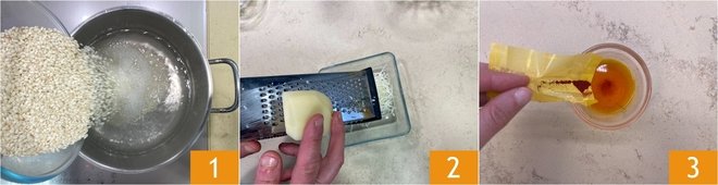 To prepare white ragù arancini, start by boiling the rice in 5 cups of salted boiling water 1, so that once cooked, the water is completely absorbed (this ensures that the starch remains in the pot, giving you very dry and compact rice). Cook for about 15 minutes. Meanwhile, grate 3.5 oz of caciocavallo cheese 2 and cut the remaining 1.75 oz into cubes for the filling. Pour the saffron into a small bowl 3.