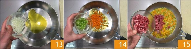 In a pan, pour a dash of oil, add the chopped vegetables for the soffritto 13 14 and let them stew for 5 minutes over low heat until soft. At this point, add the ground meat 15; let it brown over high heat.