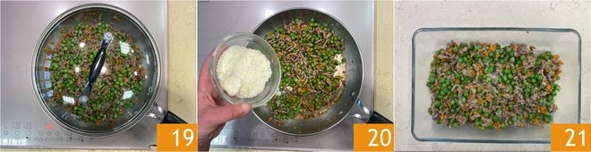 Cook over low heat with a lid for at least 15 minutes. Halfway through cooking, add the peas 19 (if necessary, you can add a little hot water, the ragù should be thick and not liquid). Once the ragù is ready, season with the grated cheese 20 and stir. Set aside to cool 21.