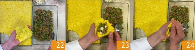 Once the rice has completely cooled (it will take at least a couple of hours), you can form the arancini. To help with the composition, keep a bowl full of water nearby so you can wet your hands and better handle the rice. Take a couple of tablespoons of rice at a time, press the mound in the center of your hand to form a hollow 22 and place a teaspoon of white ragù filling inside, then add a few cubes of caciocavallo cheese 23. Close the base of the arancino with rice 24.