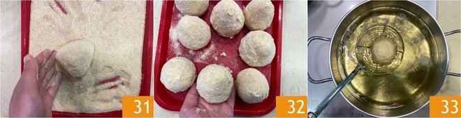 Roll them in breadcrumbs 31 and place them on a tray 32. In a saucepan, heat the oil and bring it to 338°F, then fry one arancino at a time 33, or at most 2 to not lower the oil temperature.