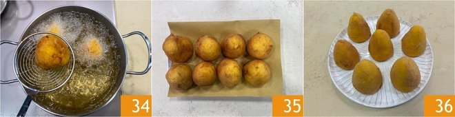 When they are golden brown, drain them 34 and place them on a tray lined with paper towels 35. Enjoy the white ragù arancini hot 36!