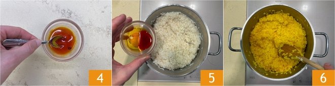 Add a little hot water and stir until a homogeneous mixture is obtained 4. Once the rice is ready and has absorbed all the liquid, incorporate the saffron dissolved in water 5. Stir to combine 6.