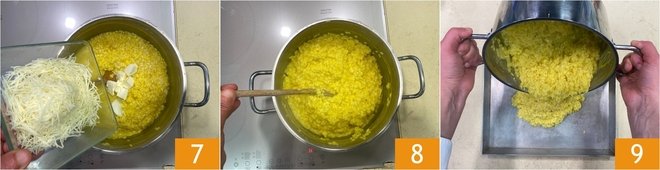 Then stir in the butter in pieces and the grated caciocavallo cheese 7 and stir one last time 8. Pour the rice onto a large, low tray 9.
