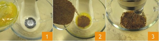 To prepare the whole wheat flour cake, first, crack the eggs at room temperature and pour them into a stand mixer with whisks 1, add the brown sugar 2, and start whisking 3.