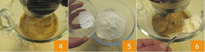 When the mixture is fluffy, add the vegetable oil gradually 4 while the mixer is still running. In a separate bowl, mix the baking powder with the sifted whole wheat flour 5, then add them to the egg mixture one spoon at a time, continuing to whisk as the dry ingredients are gradually absorbed 6.
