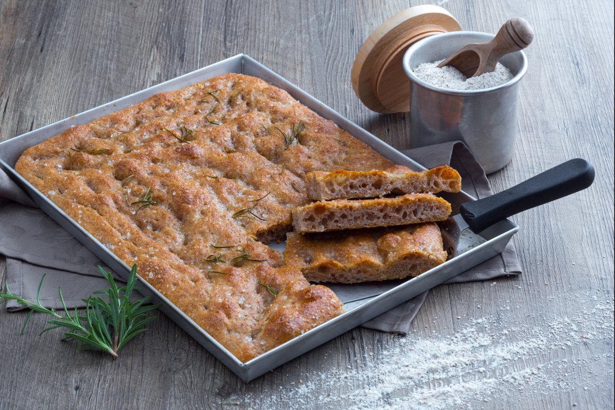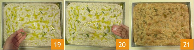 Finally, sprinkle with rosemary 19 and coarse salt to taste 20. Bake in a preheated static oven at 410°F for about 30 minutes. Once ready, enjoy your whole wheat focaccia with sourdough while still warm or let it cool on a rack 21!