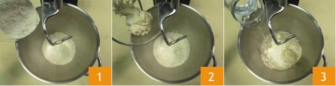 To prepare the whole wheat focaccia with sourdough, pour the whole wheat flour and bread flour into the bowl of a stand mixer equipped with a hook 1, add the sourdough that was refreshed within the previous 24 hours 2 and the water 3 and turn on to obtain a smooth dough.