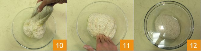 Turn the bowl, take another edge of the dough 10 and bring it to the center 11, then turn the bowl again and repeat the operation 2 more times, for a total of 4 folds. Cover the bowl with a cloth and let the dough rest for 15 minutes, then repeat the 4 folds. Cover the bowl again and let it rest for another 15 minutes before performing 4 more folds for the third and last time. At this point, cover the bowl with plastic wrap 12 and let it rise at room temperature, away from drafts, for 6 hours. After this time, place the bowl in the refrigerator and let the dough mature for 18 hours.