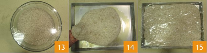 After the maturation time, remove the dough from the refrigerator 13 and spread it with your hands in a well-oiled 14x11 inch pan 14. Cover the pan with plastic wrap and let it rise at room temperature for another 2 hours 15.