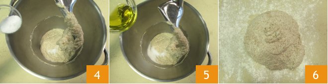 Now add the salt 4 and the oil 5 and work everything for about 10 minutes until they are completely absorbed. When the dough is smooth and well combined, place it on a floured work surface 6.