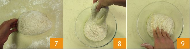 Round the dough by rolling it between your hands to obtain a regular spherical shape 7, then transfer it into a bowl. At this point, start the first fold, lifting one edge of the dough 8 and bringing it towards the center 9.