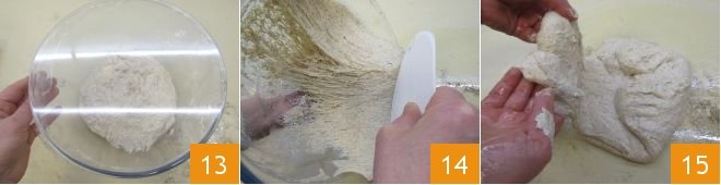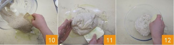 and using a dough scraper transfer the dough onto a slightly oiled work surface 10; use the scraper to give reinforcement folds 11 by bringing the outer dough towards the center. Try to shape the dough into a spherical form; as it is very hydrated, you won’t be able to work it solely with your hands, so it will be necessary to use the scraper at this stage. We suggest not adding more flour at this stage to avoid compromising the dough's consistency. Then transfer it into a large bowl 12