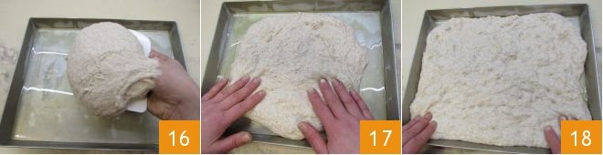 and transfer the dough into a rectangular baking pan 13.7x11 inches 16, slightly oiled, again using the scraper. Lightly oil your hands and spread the dough gently pushing it towards the edges 17 until it covers the entire surface of the pan 18.