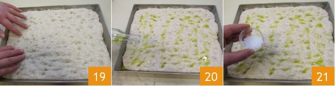 Let it rest for 5/10 minutes, then create the classic dimples with your fingertips 19, pressing your fingertips into the focaccia. Sprinkle your whole wheat focaccia with oil 20 and coarse salt 21.