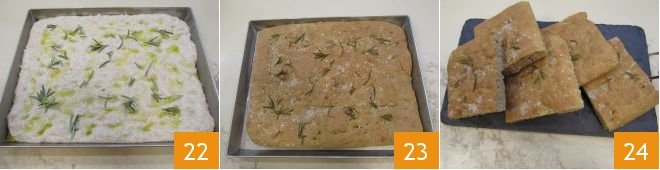 Add the sprigs of rosemary 22 and bake in a preheated static oven at 428°F for 40 minutes (we do not recommend baking in a ventilated oven). Once cooked, remove the whole wheat focaccia 23 and serve it as you like 24!