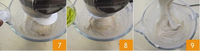 Add the fine salt 7 and oil 8, continuing to work the dough at moderate speed for another 5 minutes. Then stop the mixer 9