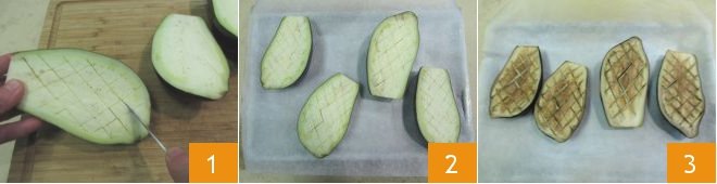 To prepare the whole-wheat spaghetti with roasted eggplant and mint, first cut the eggplants in half lengthwise and score the flesh with a knife to form a crosshatch pattern, without cutting through to the skin 1. Place the eggplants on a baking sheet lined with parchment paper with the cut side facing up 2 and bake in a preheated fan (convection) oven at 410°F for 40 minutes 3.