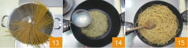 At this point the water should be boiling, so cook the spaghetti according to the package instructions 13. Pour the eggplant cream into a pan, thin it with a ladleful of the pasta cooking water 14 and warm gently. When the pasta is al dente, drain it directly into the pan and toss over medium heat to combine everything 15.