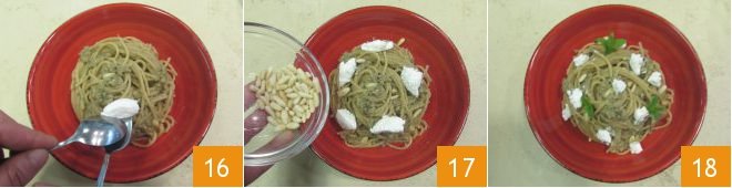 After plating, finish each plate with small dollops of ricotta 16, the remaining pine nuts 17 and a few mint leaves: your whole-wheat spaghetti with roasted eggplant and mint are ready to be served 18!