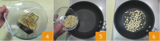 Transfer the cooked eggplants to a bowl, cover with plastic wrap 4 and let rest for 5 minutes: the steam will make it easier to separate the flesh from the skin. Meanwhile, bring a pot of water to a boil for cooking the pasta and pour the pine nuts into a hot nonstick pan 5: toast them for about 5 minutes, stirring frequently 6, then set aside.