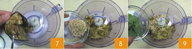 Scoop out the eggplant flesh with a spoon and place it in a blender 7, then add about half of the toasted pine nuts 8 and 6 mint leaves 9.