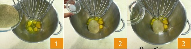 To prepare the whole wheat sponge cake, first pour the eggs into the bowl of a stand mixer fitted with a whisk attachment. Add the brown sugar 1, salt 2, and honey 3.