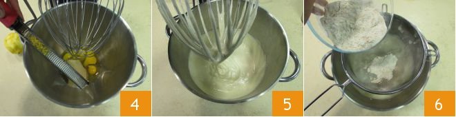 Also add the lemon zest, taking only the yellow part 4, and turn the machine to medium speed for about 15 minutes. You should obtain a fluffy, light, and frothy mixture 5. Turn off the machine and sift the whole wheat flour directly into the mixture 6.
