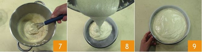 Gently mix from bottom to top with a whisk 7. Once you have an even mixture, transfer it into a 9-inch mold lined with parchment paper 8 9. Bake in a preheated static oven at 350°F for about 45 minutes.