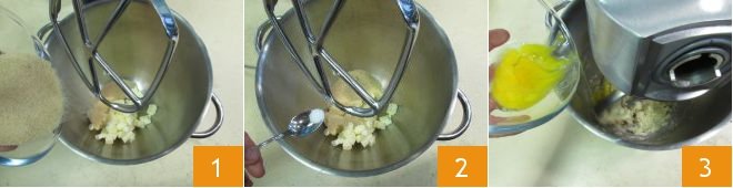 To prepare the whole wheat tart, first cut the cold butter into cubes. Place it in the bowl of a planetary mixer fitted with a paddle, add the sugar 1 and salt 2. Work the mixture until you get a cream. Then add the eggs 3,
