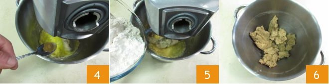 the cinnamon 4 and work until fully absorbed. Meanwhile, mix the whole wheat flour and all-purpose flour in a bowl, then reduce the speed of the mixer and also add the flours 5. Let them absorb as well 6.
