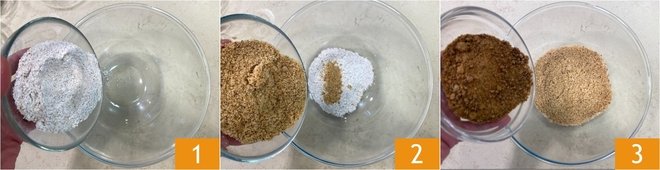 To prepare the wholemeal biscuits with dried fruit, pour into a large bowl the wholemeal flour 1, the hazelnut flour 2 and the muscovado sugar 3.