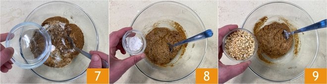 Do the same with the water 7. Also add the baking powder 8, then stir in the chopped hazelnuts 9.