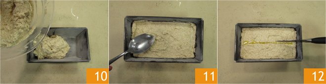Butter and flour a 8x4 inch loaf cake mold. Pour the mixture into the mold 10, distribute it evenly, and level it with the back of a spoon 11. Make a central cut with a knife previously dipped in melted butter 12.