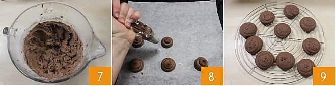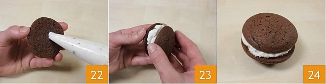 until you get a homogeneous mixture 7. Put the obtained mixture in a piping bag with a smooth nozzle with a diameter of 0.8 inches. Squeeze out mounds of the mixture about 1.6 inches in diameter on a baking sheet lined with parchment paper (you should get quite high semi-spheres) for a total of about 15 mounds per baking sheet 8. Bake in a preheated static oven at 356°F for about 13-14 minutes (320°F for 10 minutes in a fan oven), then remove the whoopies from the oven and transfer them to a wire rack 9. Let the whoopies cool.