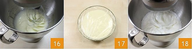 and let the beaters run for 5 minutes 16. Then transfer the cream to a small bowl and cover it with plastic wrap 17 and let it cool in the refrigerator for 5 minutes until it reaches the same temperature as the cream that you will whip later. This step is crucial to avoid creating lumps in the cream. Take the cold cream and whip it 18 with a stand mixer fitted with beaters, or with an electric mixer