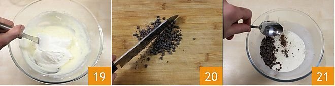 once whipped, add it to the previously prepared and cooled mixture 19, mixing it by rotating a rubber spatula from bottom to top to not deflate the cream. Chop the chocolate chips with a knife 20 and add them to the cream, stirring to combine well 21.