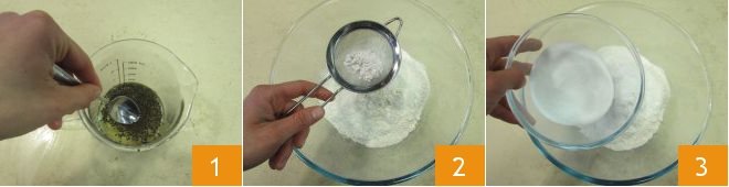 To prepare the wine cookies, start by placing the anise seeds in the white wine, stir 1 and set aside. Pour the sifted flour with the baking powder 2, a pinch of salt, and sugar 3 into a bowl.
