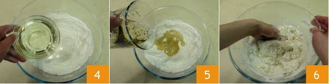 Mix by hand and then create a basin, where you can pour the oil 4 and wine with the anise seeds 5. Knead with your hands. 6