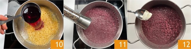 In a pot, pour the vegetable broth and red wine 7, then bring to a boil and keep warm. Take back the saucepan in which you cooked the onion and toast the rice over medium-high heat for about 5 minutes, stirring often 8. When the grains are nice and hot, add the onion 9.