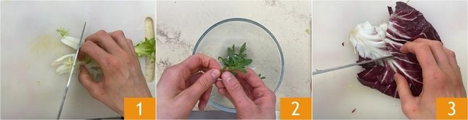 To prepare the winter pasta salad, start with the vegetables: take the endive and separate the tops from the stem, then cut the stalks into pieces about 1.5 inches long 1. Remove the stems from the arugula and collect the leaves in a bowl 2. Remove the internal white part of the radicchio 3.