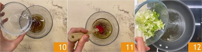 Thin the sauce with water 10 and mix 11, then set the dressing aside. Move on to cooking the vegetables: in a pan, heat the seed oil and add only the endive stalks 12.