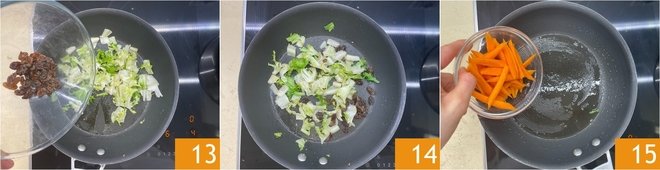 Add the raisins, salt, and sauté over medium heat for 3-4 minutes until slightly wilted 14. Set aside and heat the sesame oil in the same pan, then add the carrots 15.