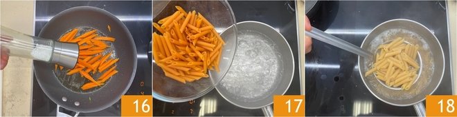 Salt 16 and also sauté these for 7 minutes over medium heat to slightly wilt them; they should remain crunchy. Take care of the pasta: bring a pot of salted water to a boil, then cook the lentil penne 17 and drain after 6-7 minutes 18.