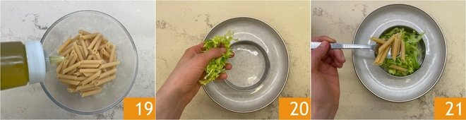 Transfer them to a bowl and season with extra virgin olive oil 19. Everything is ready to assemble the salad in layers: inside a round pastry cutter, 4 inches in diameter, place the reserved endive tops 20, then add the pasta 21.