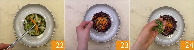 Continue with the sautéed endive stalks, sautéed carrots 22, red mizuna, radicchio, and arugula. 23