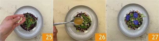 Add the sliced almonds 25, then remove the ring and complete with the sauce 26, chervil leaves, and edible flowers. Your gourmet winter pasta salad is ready to be served 27!