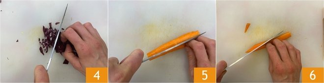 Cut the leaves into thin strips 4. Peel the carrots, cut them in half 5, then slice them into diamonds, roughly the same size as the penne 6.