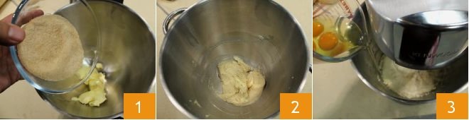 To make the witches with hats, start by preparing the muffins: in the bowl of a stand mixer fitted with a paddle attachment, add the brown sugar along with the softened butter at room temperature 1 and turn on the paddle until you obtain a smooth cream 2. Stop the mixer and replace the paddle with the whisk, then add the whole eggs one at a time, waiting for one to be absorbed before proceeding with another 3.